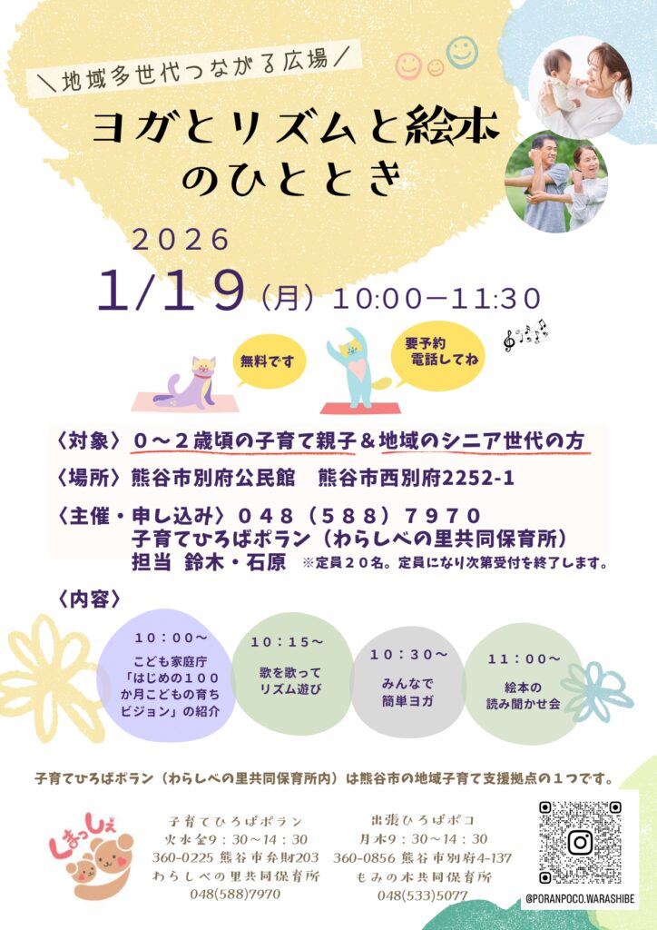 多世代つながる広場ヨガとリズムと絵本のひととき 2026 1/05 子育て支援 出張広場ポコ,子育て広場ポラン 2026年1月5日 子育て支援 出張広場ポコ,子育て広場ポラン ポラン通信1月号 関連記事 ポラン通信1月号 2026年1月5日 ポラン通信10月号 2025年10月3日 ポラン通信9月号 2025年9月2日 ポラン通信7月号 2025年7月7日 ポラン通信6月号 2025年6月12日 子育てひろばポランNEWS春号/ポラン通信5月号 2025年5月2日 〈ポラン・ポコ〉4月の予定 2025年4月3日 〈ポラン・ポコ〉3月の予定 2025年3月1日